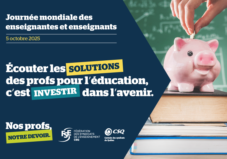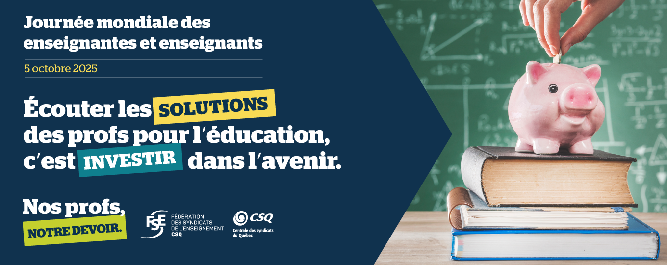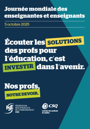 À l’occasion de la Journée mondiale des enseignantes et enseignants, célébrée le 5 octobre de chaque année, la Fédération des syndicats de l’enseignement (FSE-CSQ) souhaite rendre hommage aux enseignantes et enseignants du Québec qui sont mobilisés et engagés chaque jour pour accompagner avec succès les élèves, et ce, en dépit de conditions d’exercice souvent difficiles.