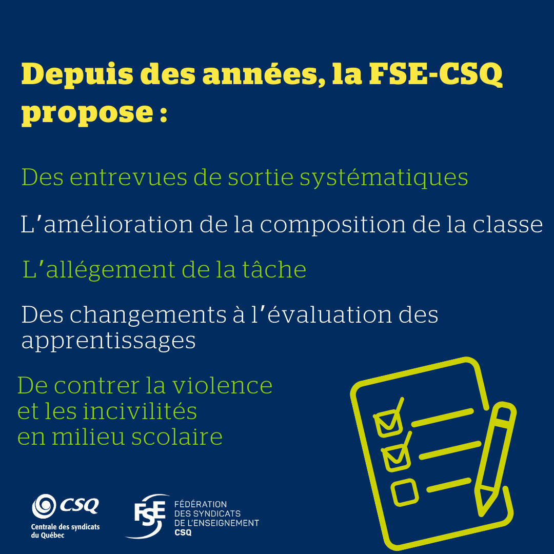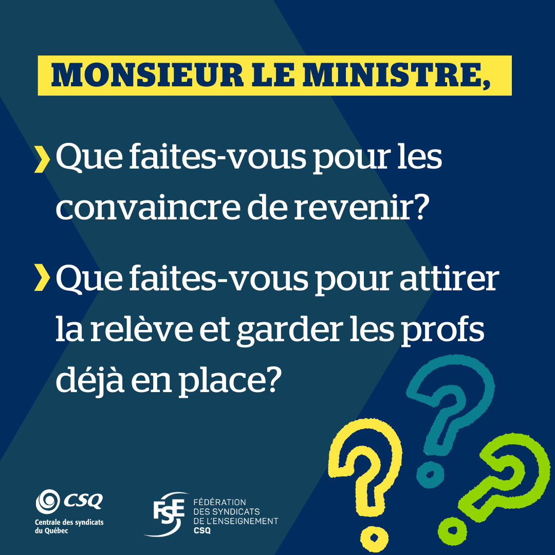 De plus, la FSE-CSQ interpelle le ministre de l’Éducation afin de savoir qu’a-t-il fait pour convaincre les 17 000 personnes ayant quitté le réseau, et qui sont encore en âge de travailler, de revenir.