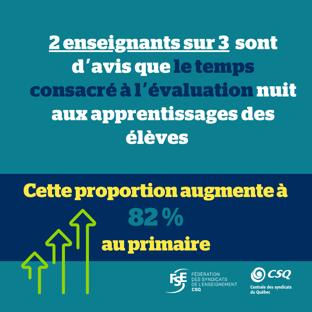 De plus, deux enseignants sur trois considèrent que le temps consacré aux évaluations est à ce point important qu’il nuit aux apprentissages des élèves; cette proportion monte à 82 % pour le primaire.