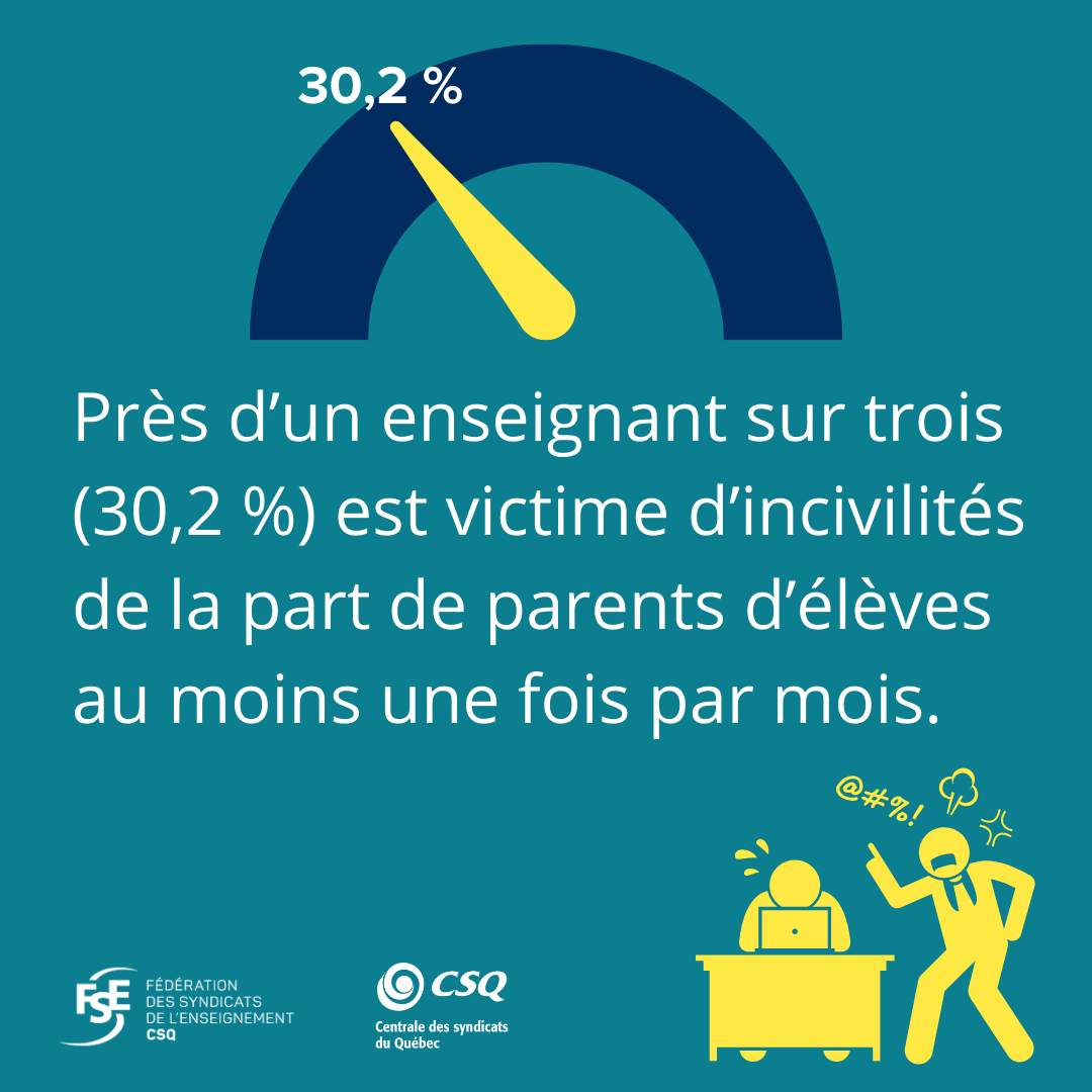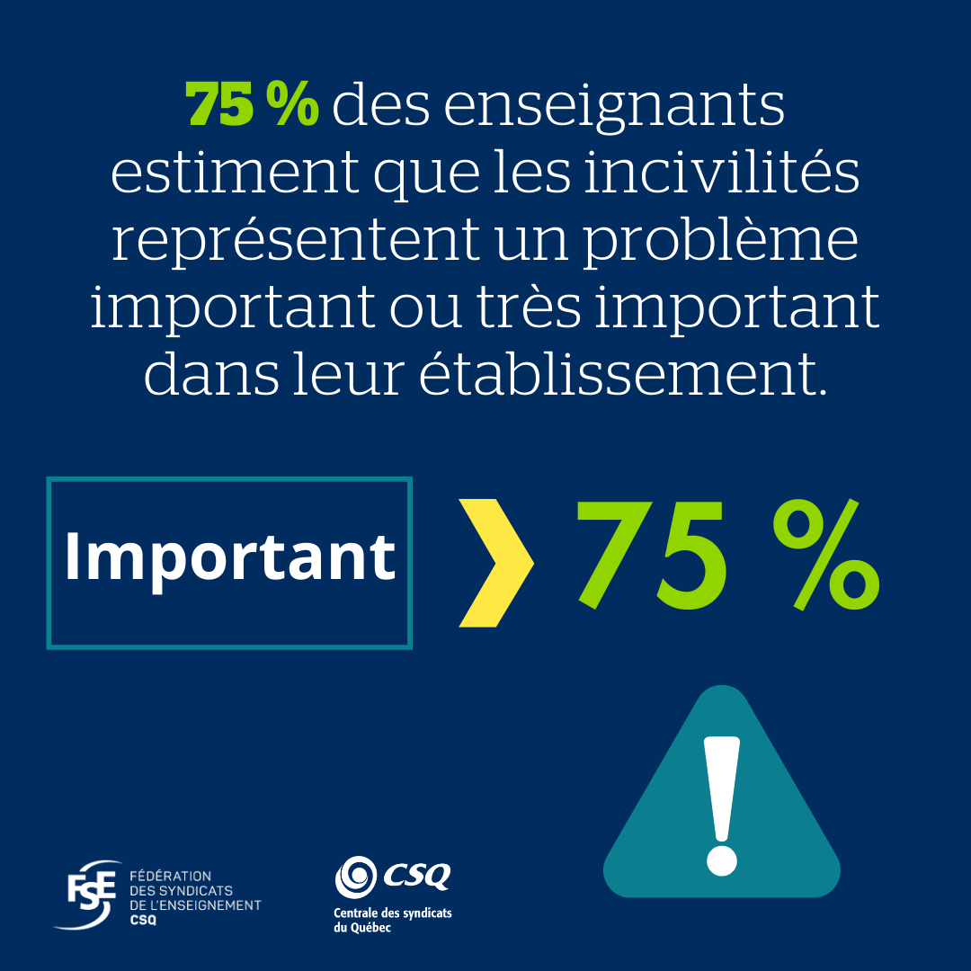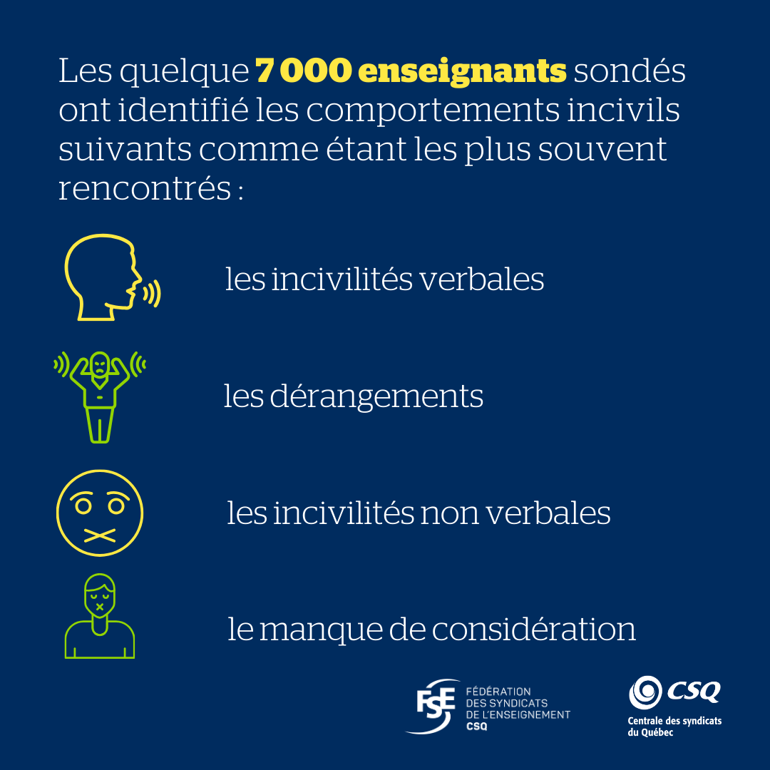 C’est à l’automne 2024 que la Fédération des syndicats de l’enseignement (FSE-CSQ) a mené une consultation auprès des enseignantes et enseignants concernant les incivilités en milieu scolaire. Témoignant de l’importance qu’ils accordent à cet enjeu, 7 000 enseignantes et enseignants ont pris le temps d’y répondre malgré leur horaire plus que chargé.
