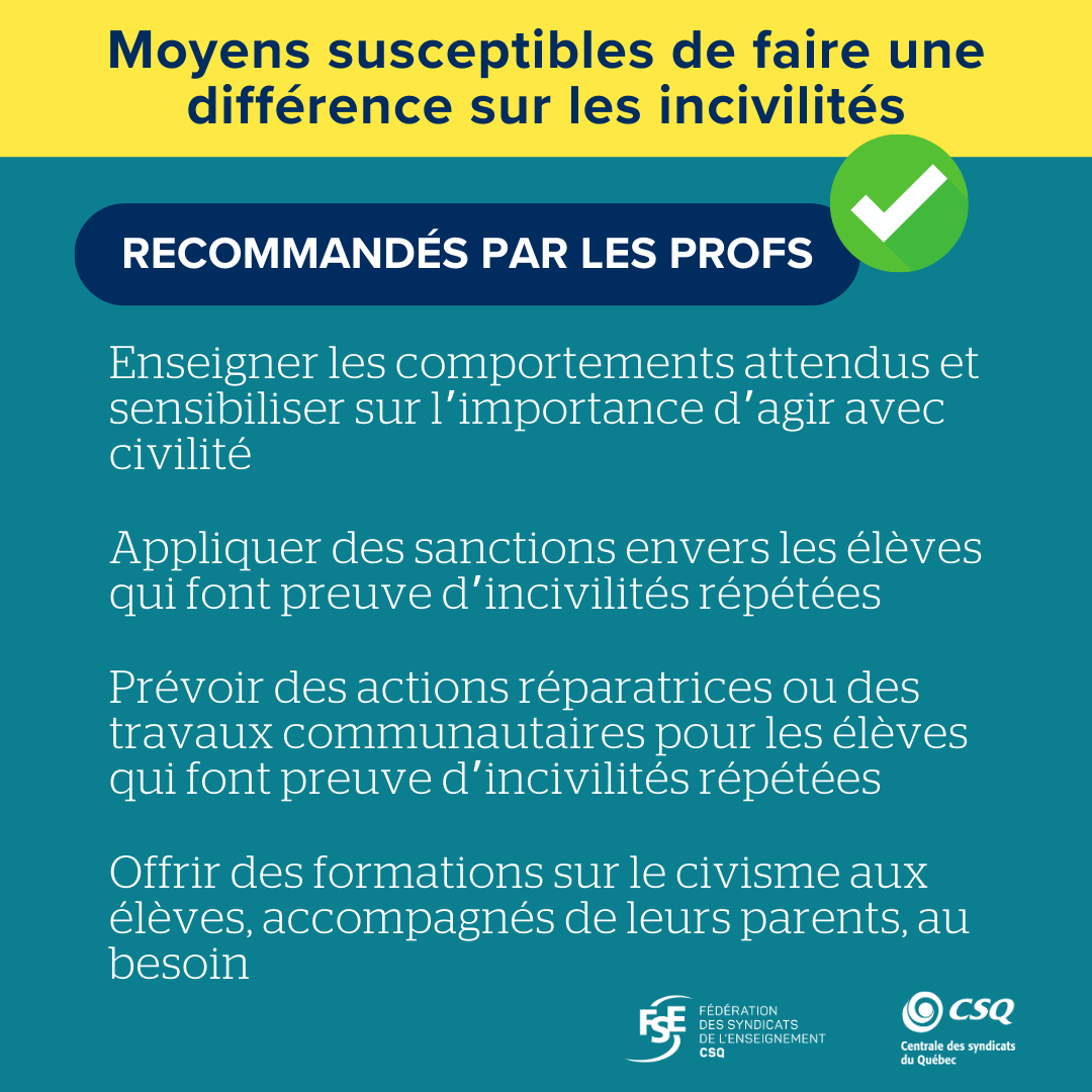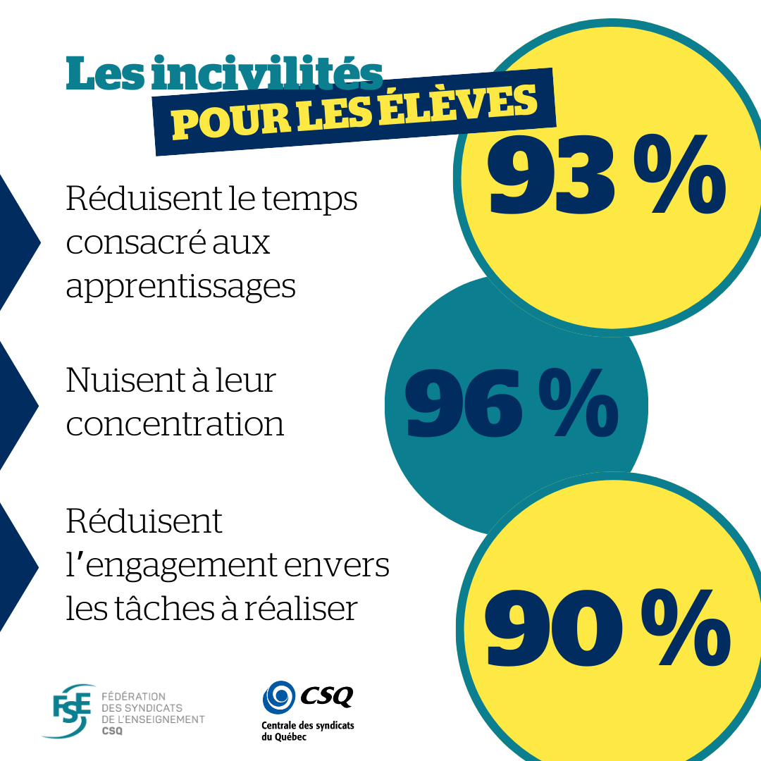- Les enseignantes et enseignants croient que les incivilités nuisent à la concentration des élèves (96 %) et réduisent le temps consacré aux apprentissages (93 %);