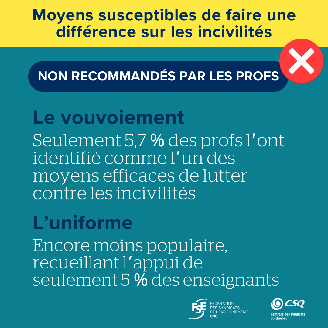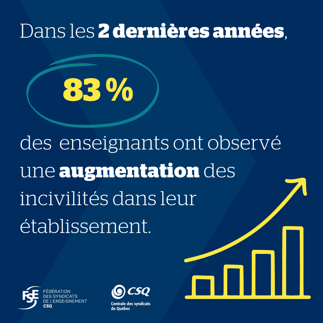 - 83 % des enseignantes et enseignants estiment que les incivilités ont augmenté au cours des deux dernières années;