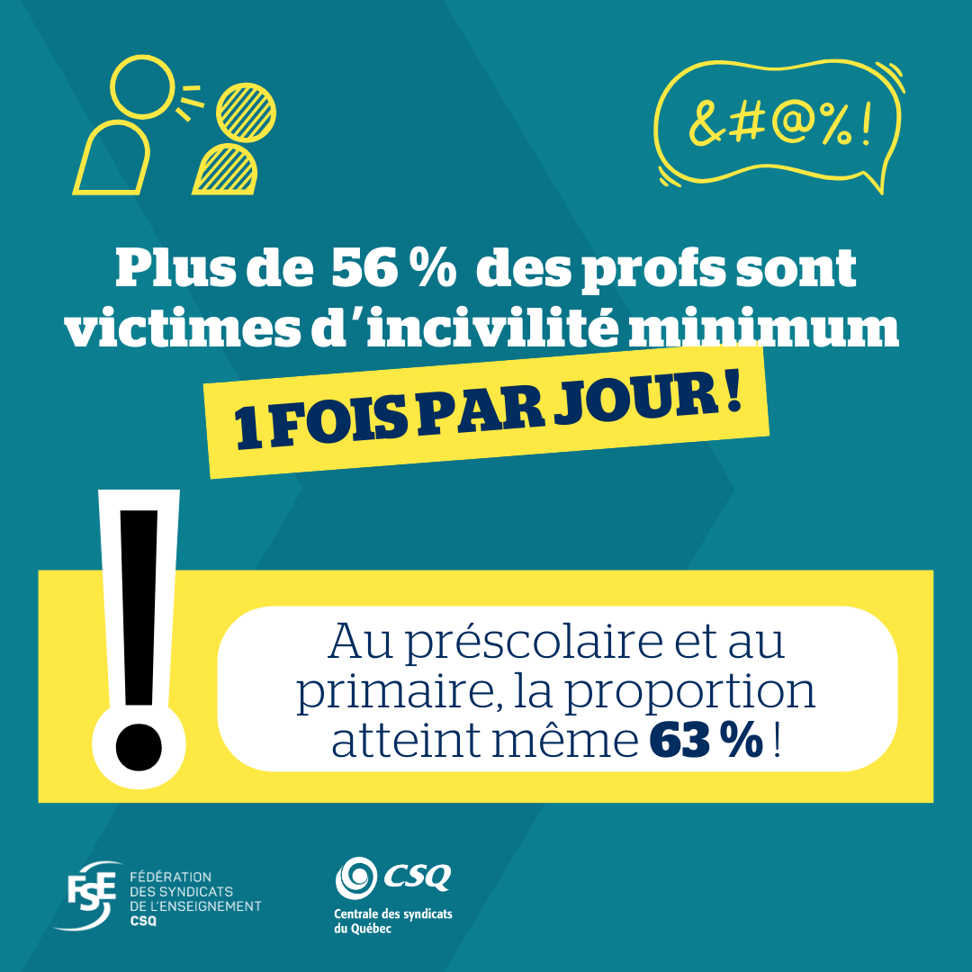 - 56 % des enseignantes et enseignants sont victimes d’incivilité au moins 1 à 4 fois par jour (la proportion atteint même 63 % au préscolaire et au primaire);