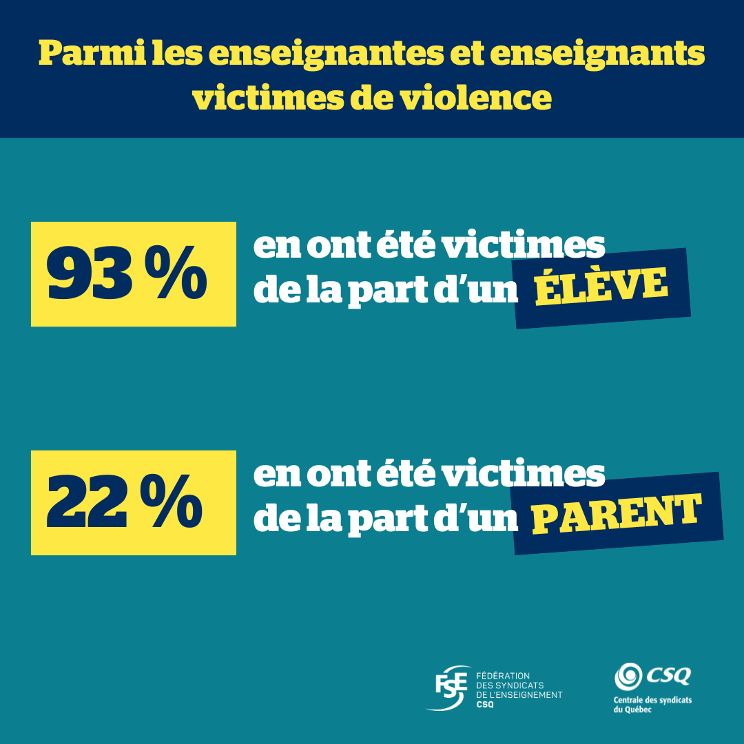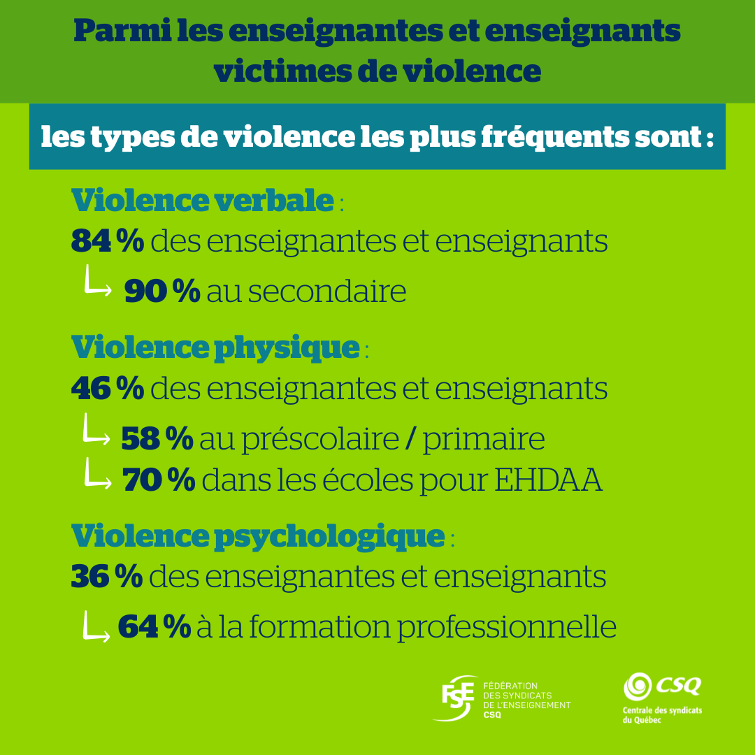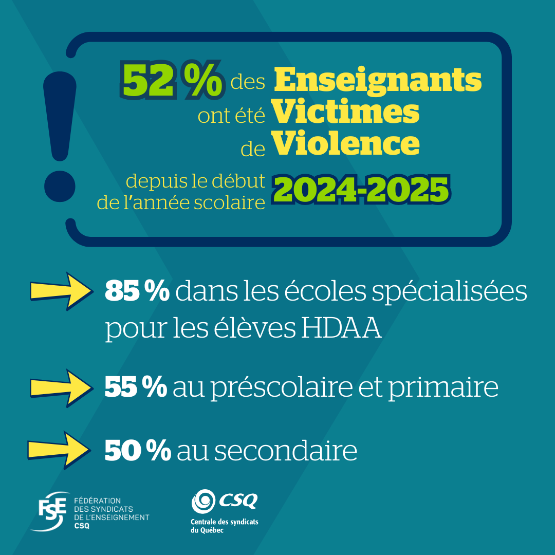 Selon Richard Bergevin, président de la FSE-CSQ : « Il faut établir une culture de la tolérance zéro, où chaque geste de violence doit être dénoncé et où les services de soutien aux victimes doivent être systématiques. Nous le répétons, la violence, ça ne doit jamais faire partie du travail! ».