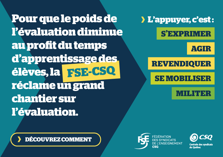 La FSE-CSQ s’assurera d’impliquer les enseignantes et enseignants et de porter leurs préoccupations sur toutes les tribunes. Au moment opportun, la Fédération consultera ses membres sur les améliorations souhaitées et les propositions à mettre de l’avant en évaluation des apprentissages, par exemple, les résultats à produire au bulletin, l’évaluation à la formation générale des adultes (FGA) et à la formation professionnelle (FP) ou les enjeux en évaluation pour les élèves autochtones (Cris, Inuit et Naskapis).